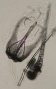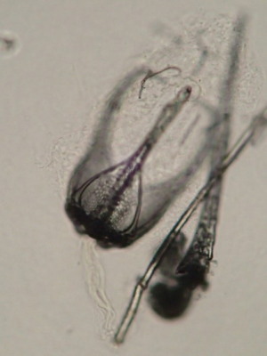 長さは1~3mmほどで、柄の部分は骨のない柔らかい組織で自由に曲げることができます。先に端は三又にわかれた顎があり、ものをつかむことができます。
