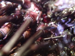 ムラサキウニの棘の根元を見ると、棘を動かすための筋肉があります。