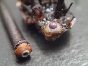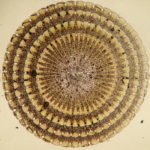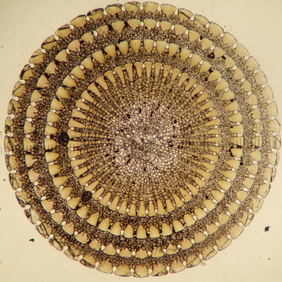棘を切断して断面にヤスリをかけると、年輪ような模様があらわれます。スカスカしたステレオム構造の部分と、中身の詰まった柱状の部分の繰り返しになっています。